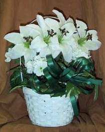 Saint Patrick's Day Basket filled with white lilys and 		carnations.